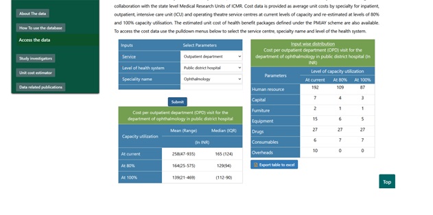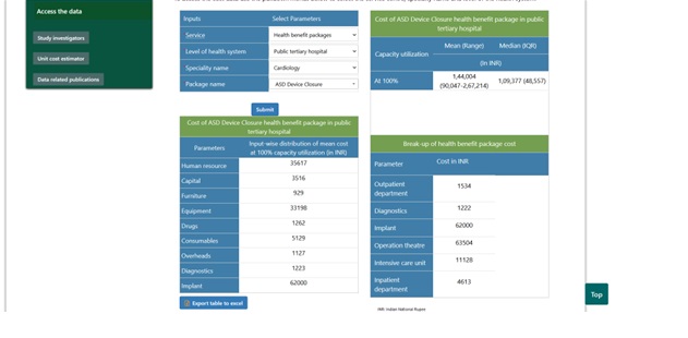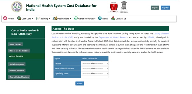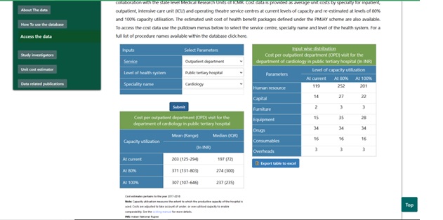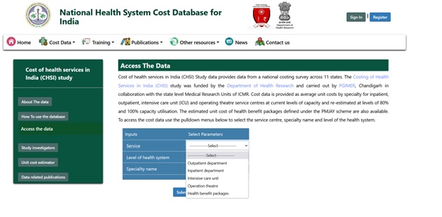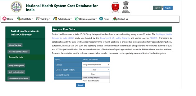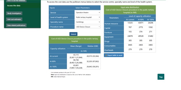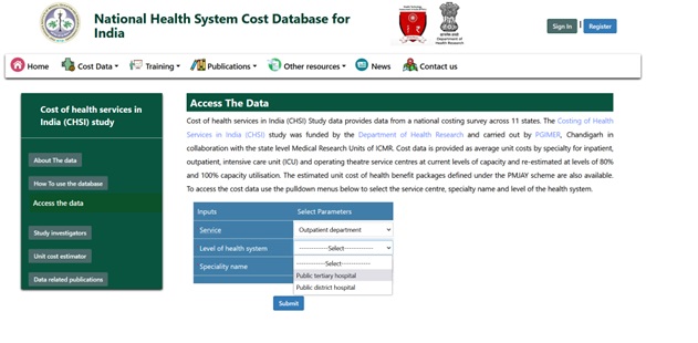 This page provides a step by step guide on how to access the Cost of health services in India (CHSI) Study; please also see the video demonstrations below. How to access cost of health services in India (CHSI) Study data database Step: 1 From the “Cost Data” option on the website’s main page, select “CHSI Study”. Step: 2 From the options available under the dropdown menu, chose “Access the data”. Step: 3 The figure below displays the “Front view” of the CHSI Study data. Step: 4 To access the available data, select the service type which will include Outpatient Department, Inpatient Department, Intensive Care Unit, Operation theatre and Health Benefits Package. Step: 5 Further, select the level of the health system for which the estimates are required. The step will allow you to choose from public tertiary or district hospital data. Step: 6 Now select the name of the specialty for which the estimates are to be viewed. Step: 7 The figure below displays the cost per OPD visit for the department of Cardiology in a public tertiary hospital. These estimates can be exported in excel format by clicking on the “Export table to excel” option below. Step: 8 The figure below displays the cost per OPD visit for the department of Ophthalmology in a public district hospital. These estimates can be exported in excel format by clicking on the “Export table to excel” option below. Step: 9 The figure below displays the cost of operation theatre services for ASD Devise closure procedure in a public tertiary hospital. These estimates can be exported in excel format by clicking on the “Export table to excel” option below. Step: 10 The figure below displays the cost of the health benefits package for ASD Devise closure in a public tertiary hospital. These estimates can be exported in excel format by clicking on the “Export table to excel” option below. Click here to download the guide on how to use the (CHSI) study data.